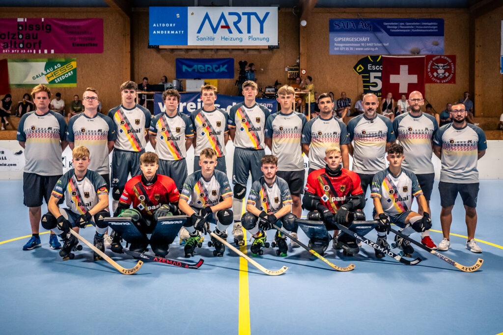 Team U20-Herren Deutschland 2022 Ganz hinten (v.l.) Sandro Caramanno, Tom Drübert, hintere Reihe (v.l.): Carsten Tripp (Team-Manager), Julian Brügmann (Co-Trainer), Cristiano Neves, Dennis Schneider, Paul Ronge Tim Ganser, José Aleixo (Trainer), vordere Reihe (v.l.): Marco Aleixo, Joshua Heinrichs, Moritz Stertkamp, Ben Kessens, Jonas Huth, liegend: Ben Barnekow.